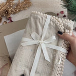 Christmas Baby gift set - Beige Muslin swaddle with pom pom trim and ginger giraffe toy
