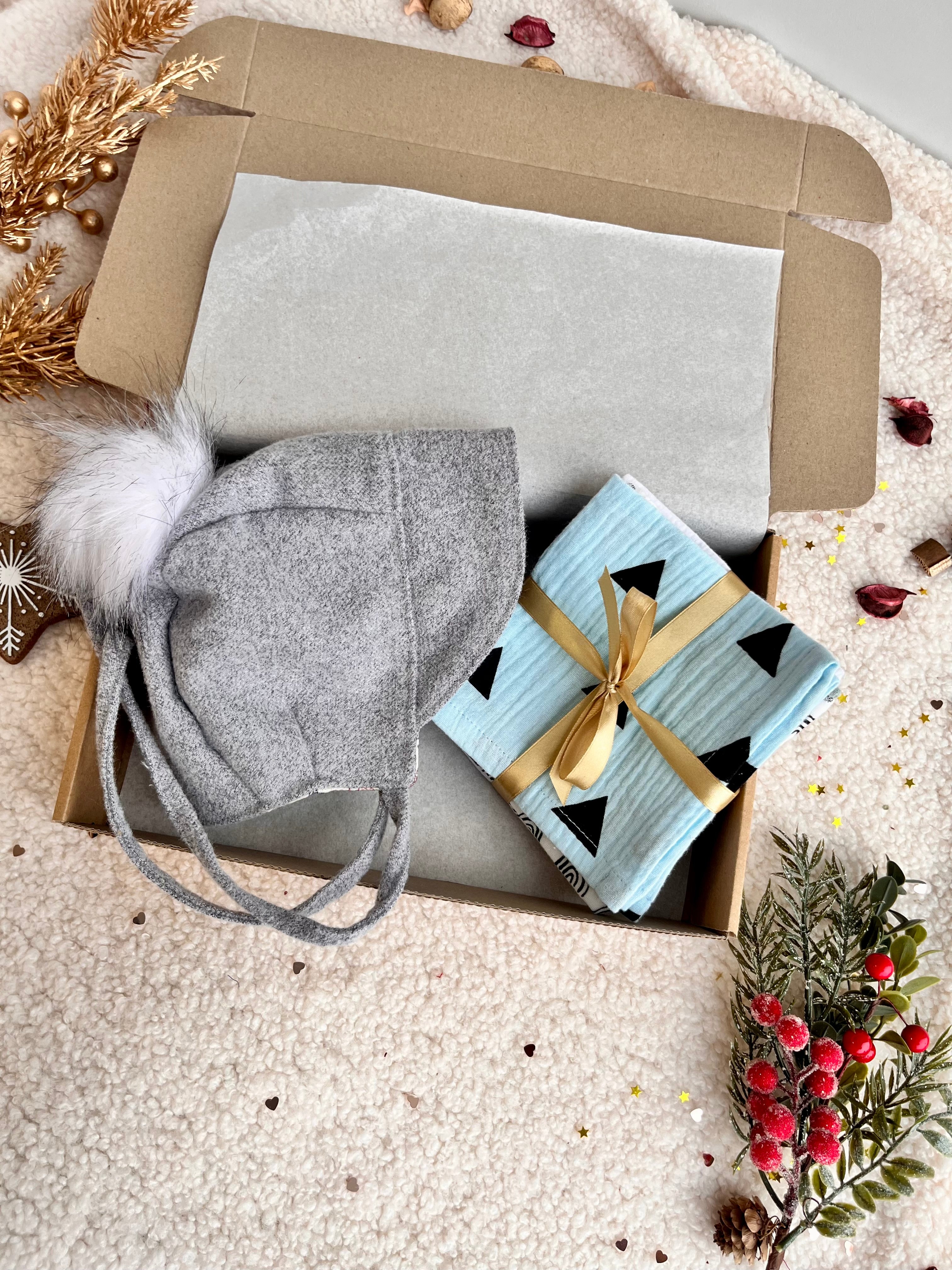 This adorable baby boy gift set includes a light grey wool hat with a soft white faux-fur pompom and a comfortable cotton lining, suitable for babies from 0 to 6 months.