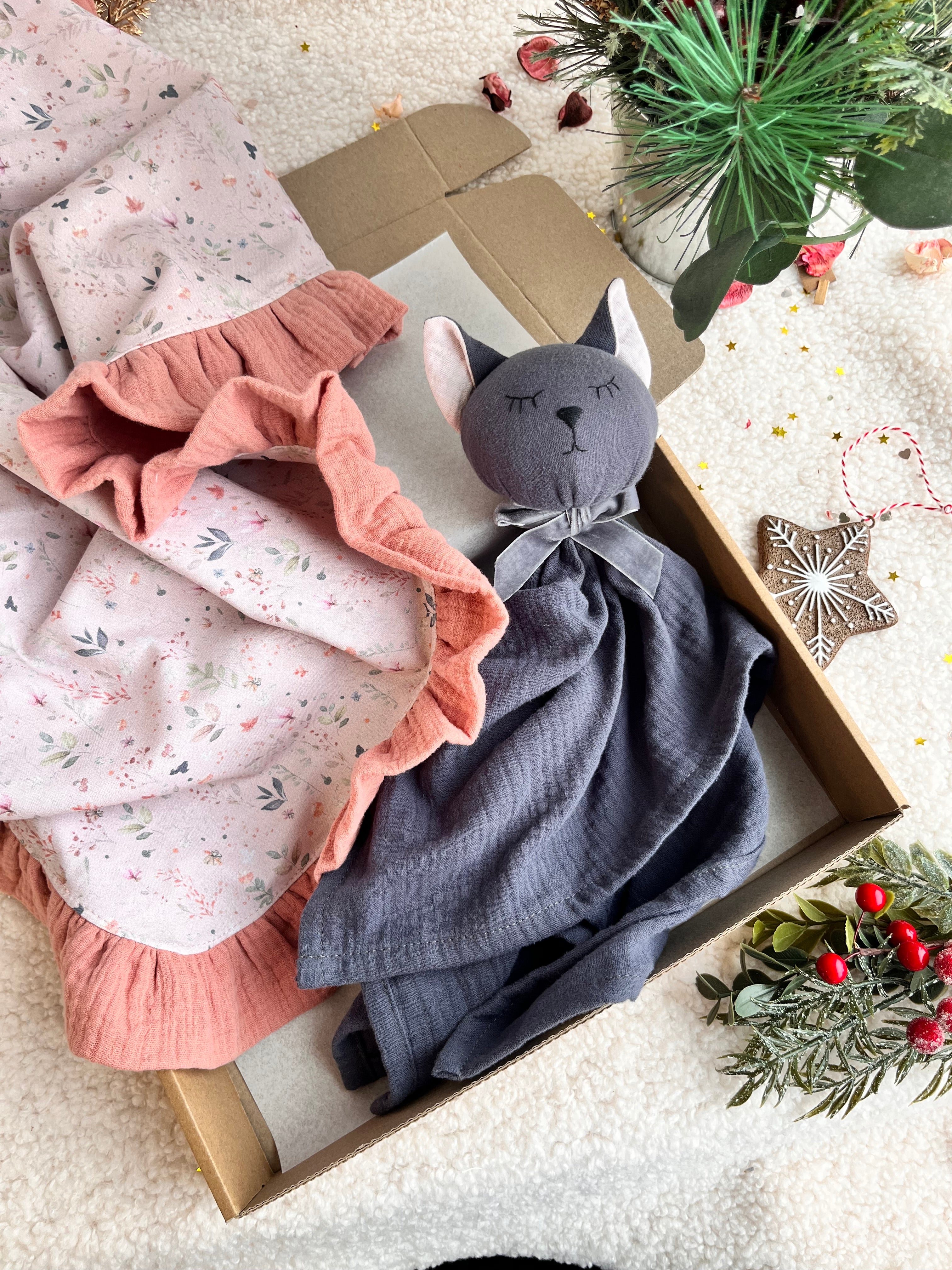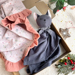 This delightful Christmas baby gift set includes a soft dusty pink floral muslin swaddle blanket with ruffles, sized 75x95 cm, and a cuddly grey muslin Cat baby comforter.
