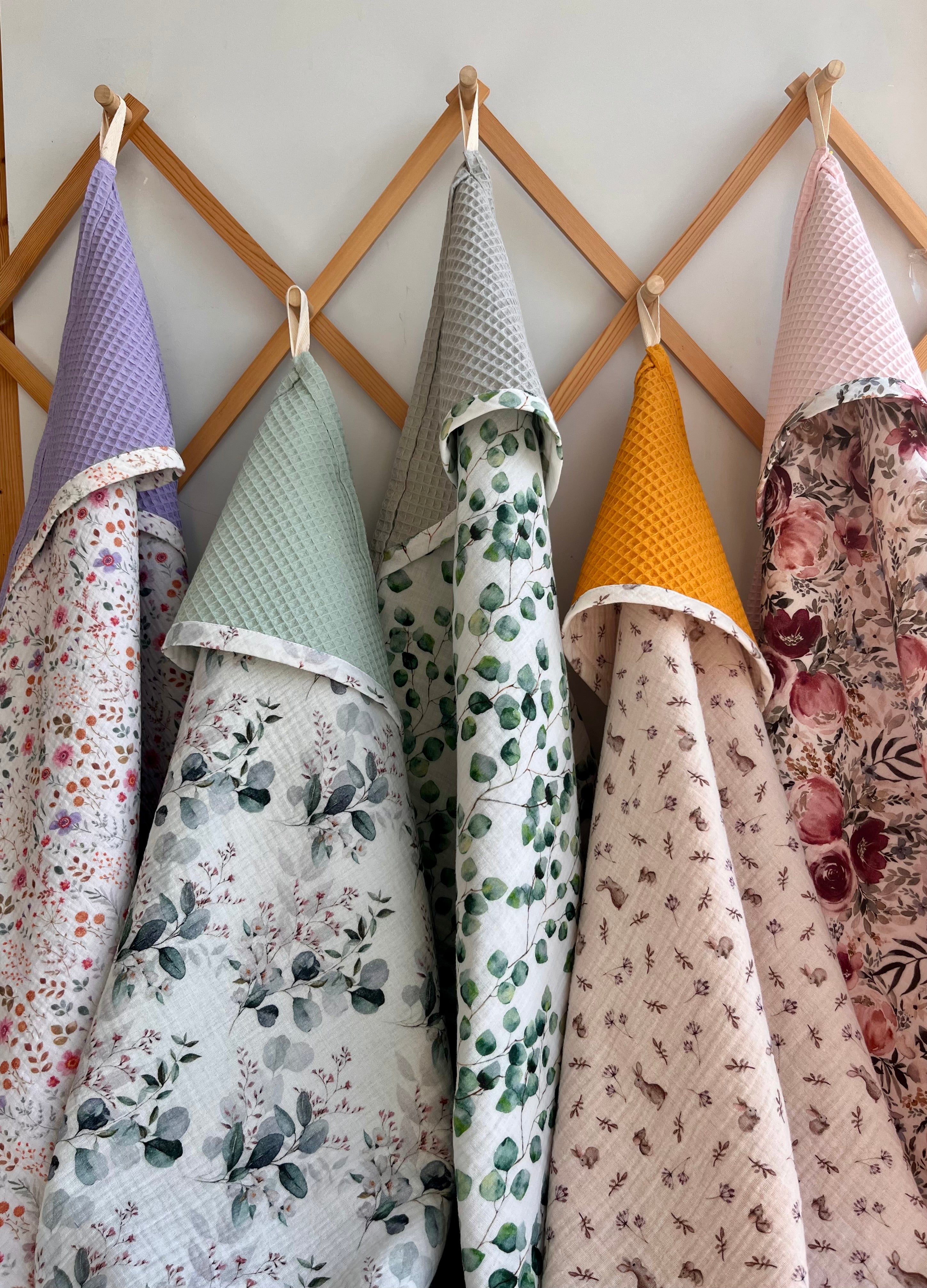 Hooded towel designs with muslin print and waffle texture, featuring various patterns and colors.