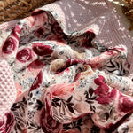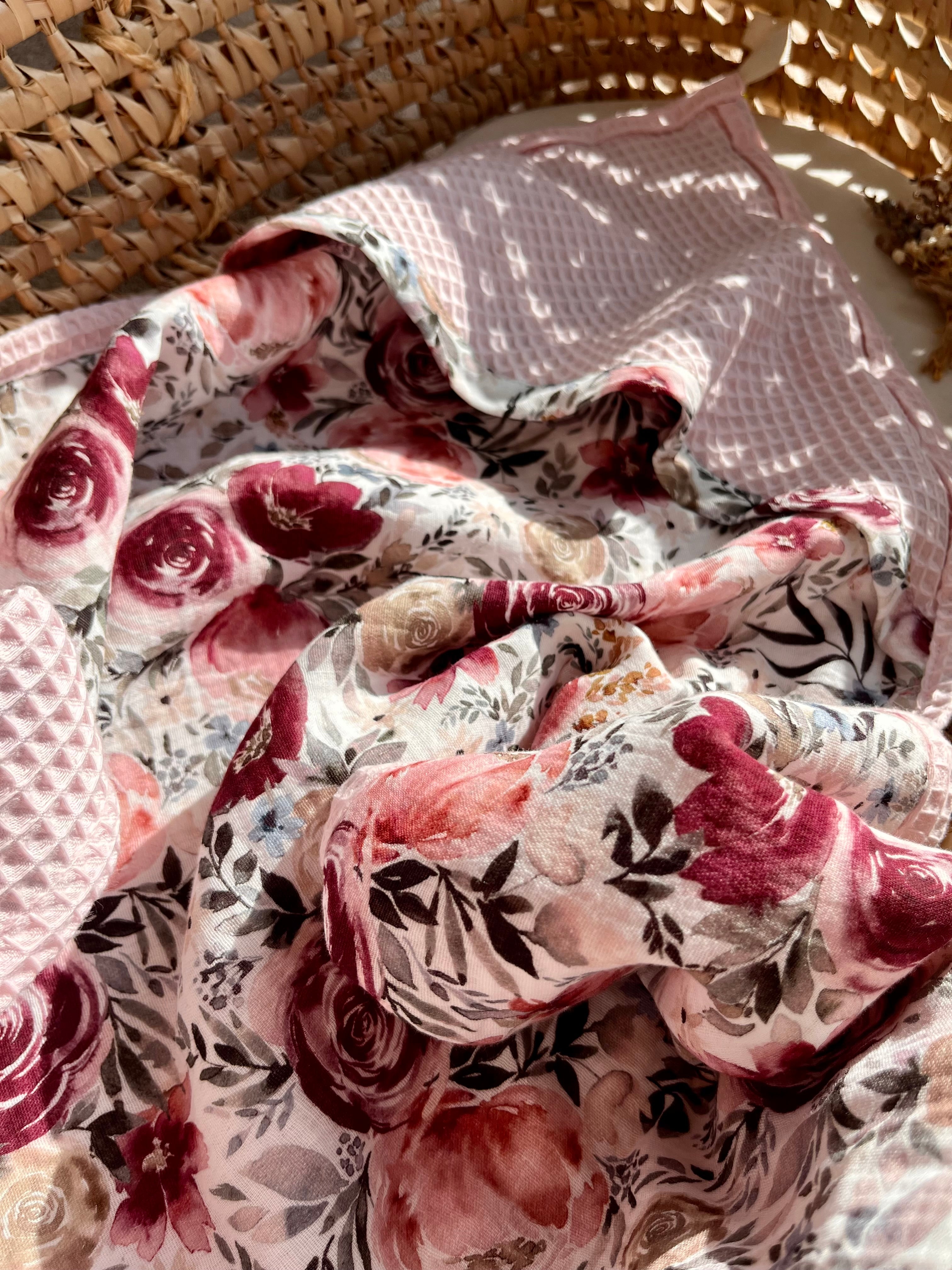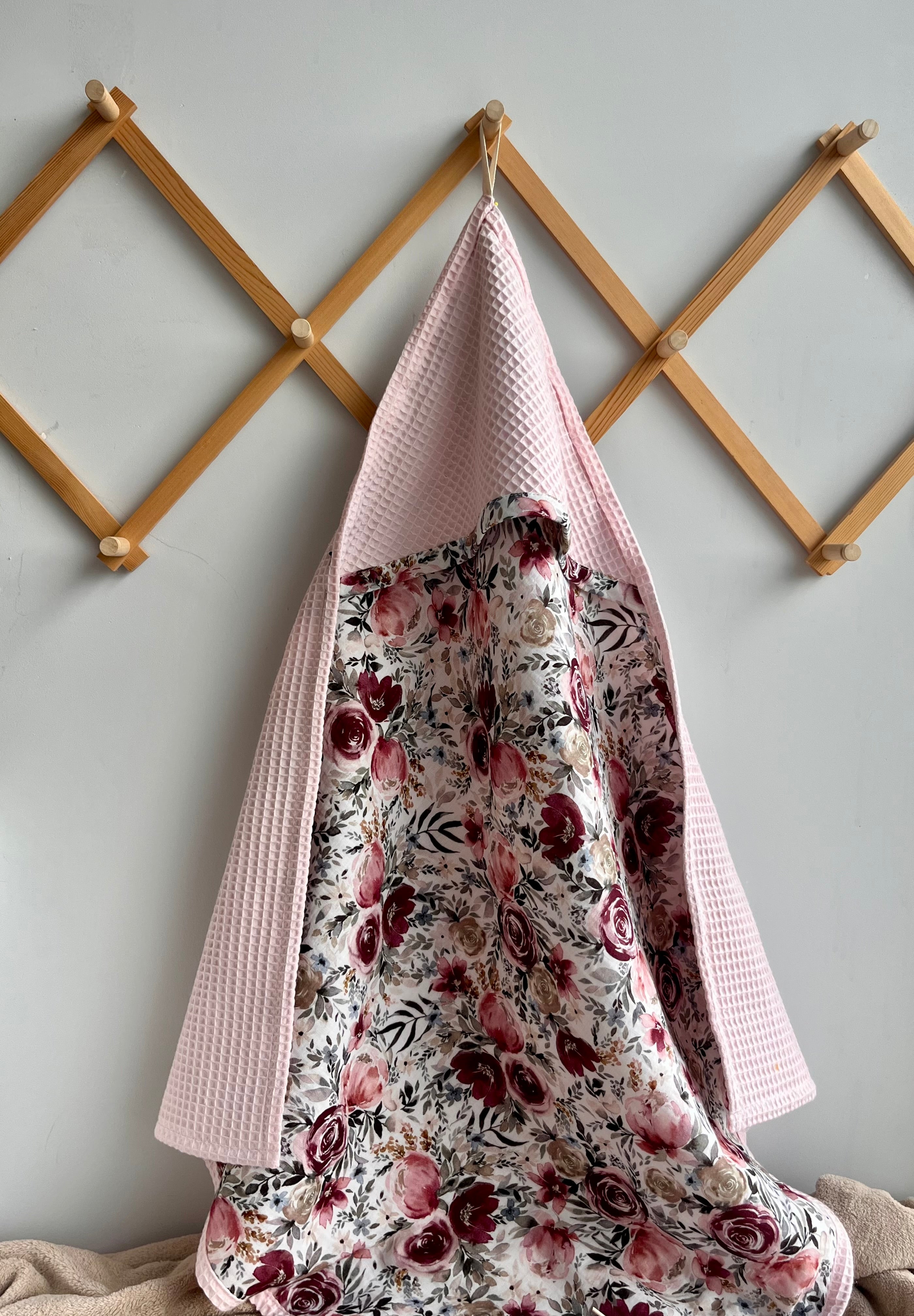 Floral-patterned baby hooded towel on a woven surface