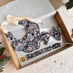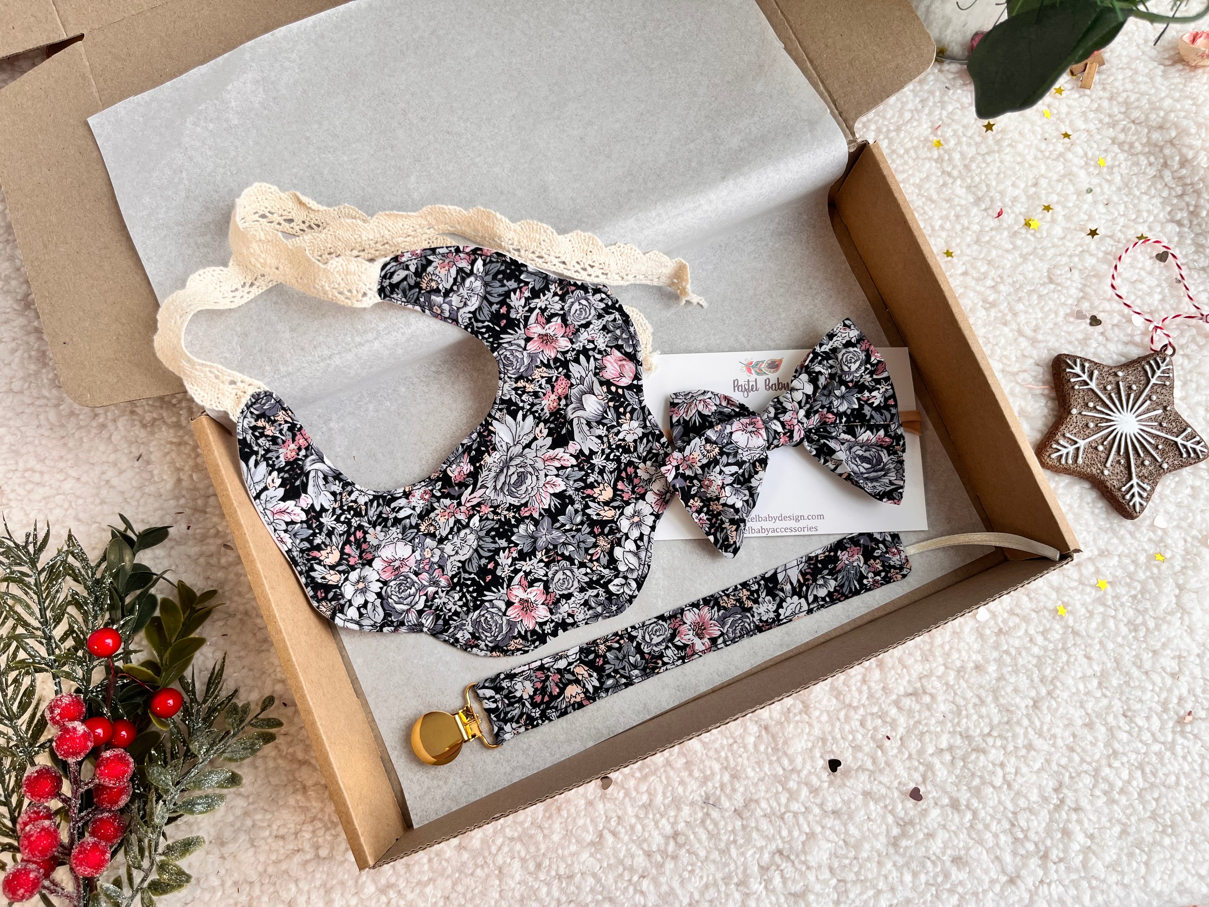 Šis burvīgais dāvanu komplekts meitenītei ietver lācīti ar mitrumnecaurlaidīgo kārtu un mežģīņu saitēm, pieskaņotu knupīša turētāju un mīlīgu matu lentīti uz neilona gumijas no skaista puķaina kokvilnas auduma.