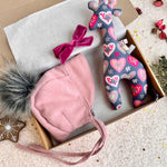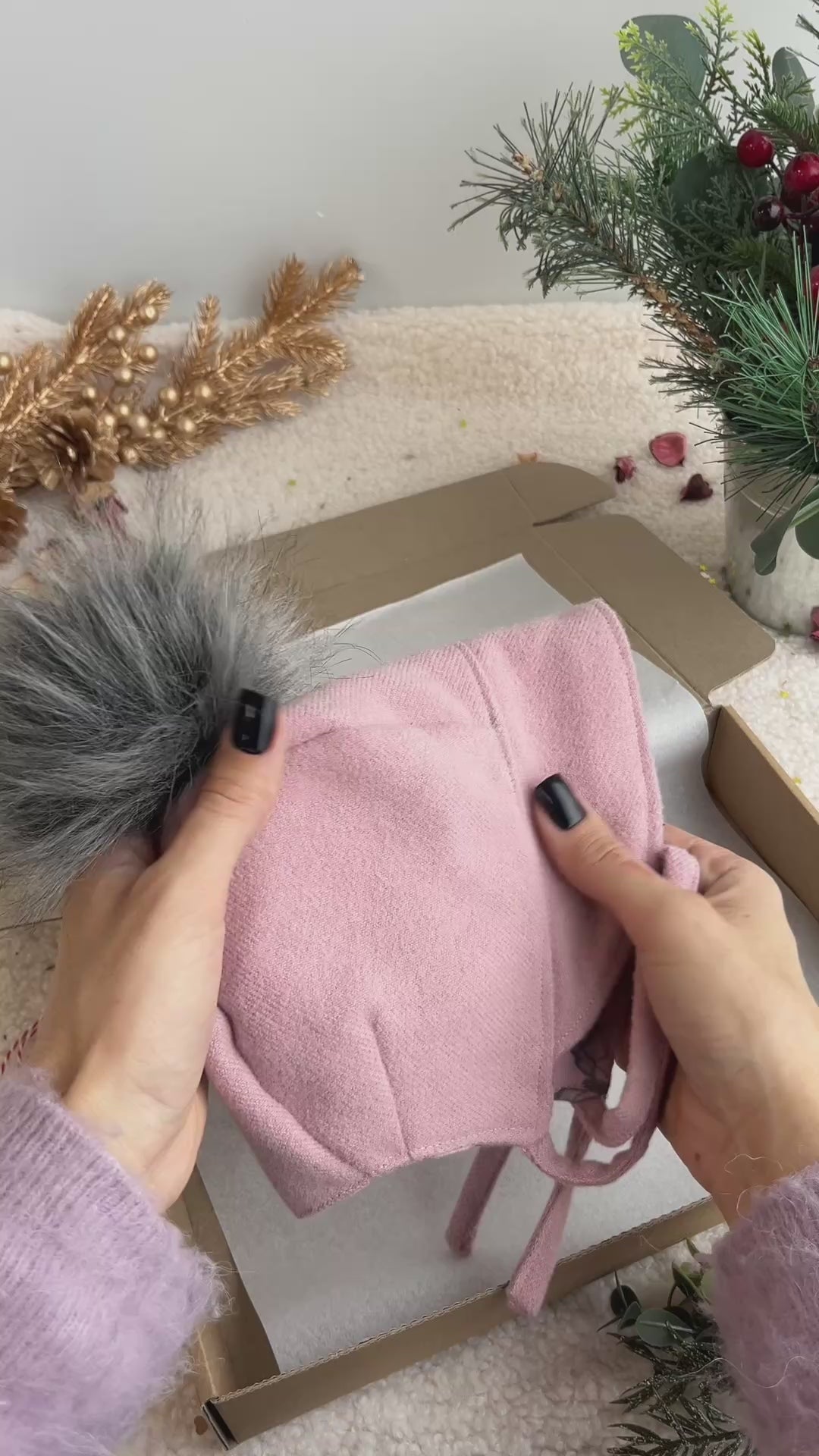 Šis mīlīgs dāvanu komplekts meitenītei ietver vilnas cepurīti maigi rozā tonī ar pelēku mākslīgās kažokādas bumbuli un kokvilnas oderi, piemērotu bērniem no 0 līdz 6 mēnešiem.