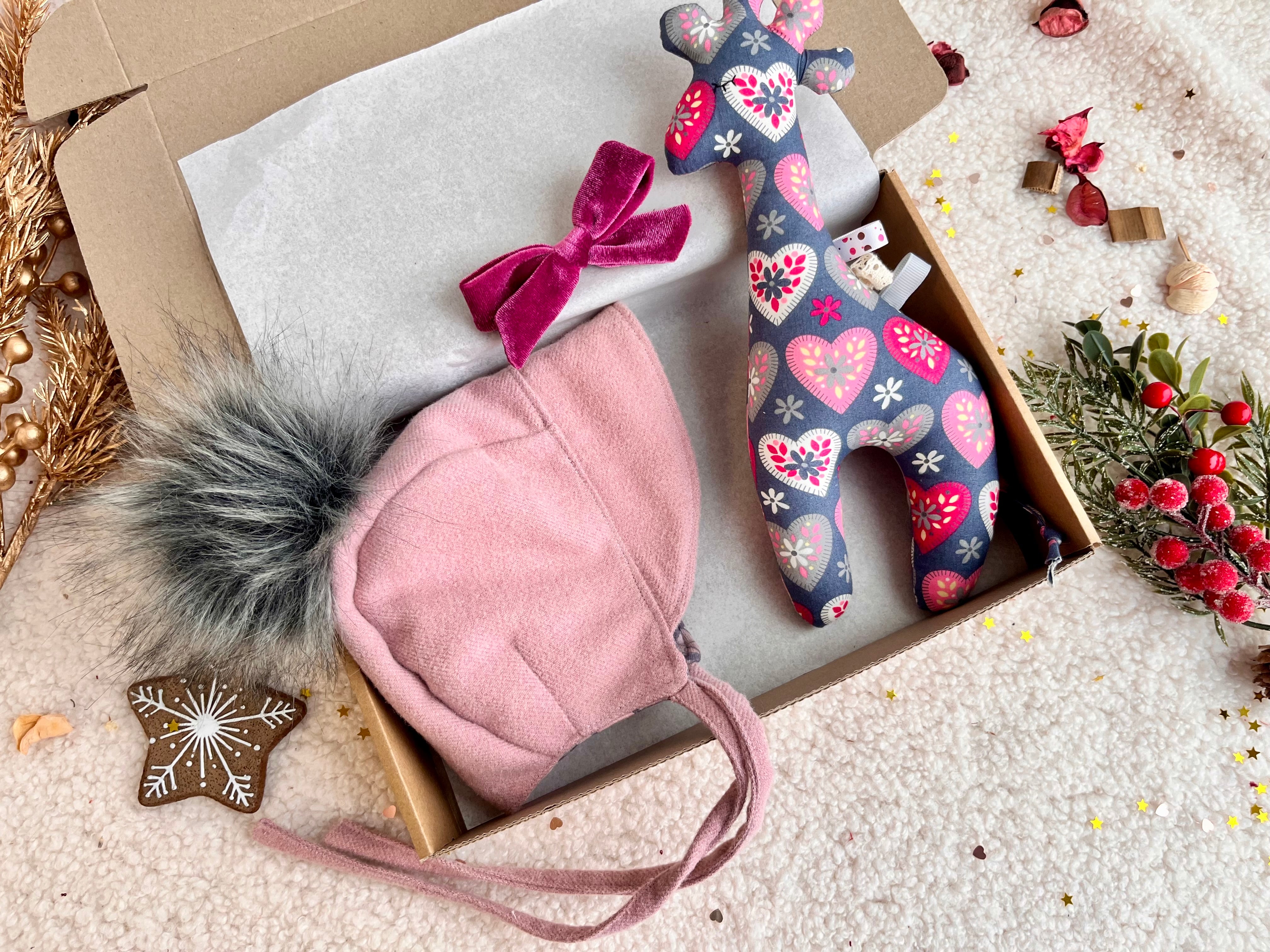 Komplektā ir arī koši rozā samta matu sprādze un mīkstā rotaļlieta - žirafe ar taustes lentītēm, kas lieliski piemērota sensorajām spēlēm.